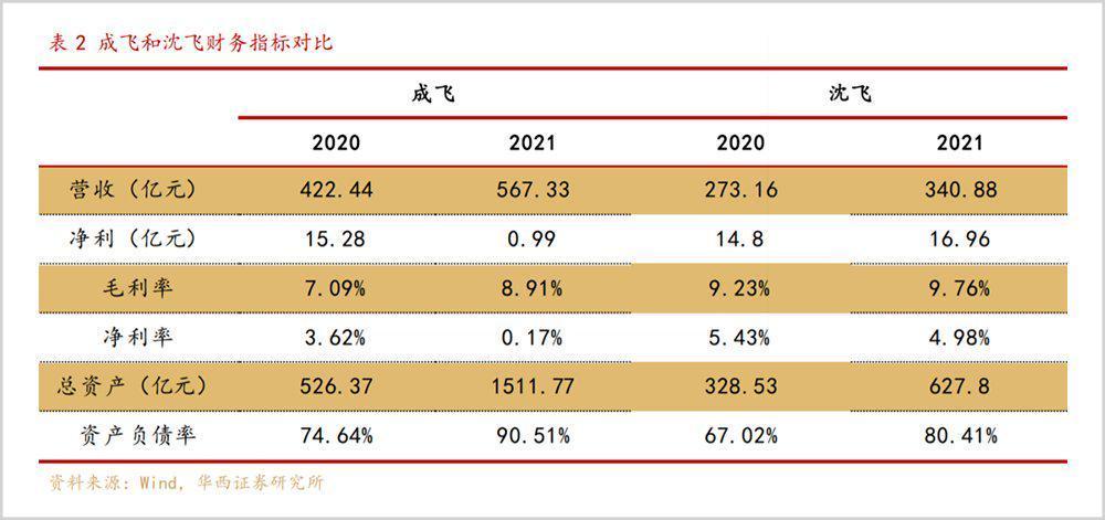 据华西证券研究,以2020年和2021年成飞和沈飞业绩对比为例,虽然成飞的总资产和营收规模远大于沈飞,但包括毛利率和净利润率等盈利指标却逊于沈飞。