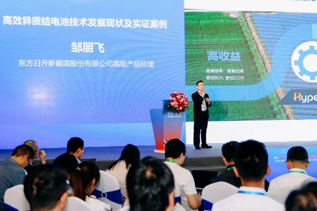 近日,主题为“双碳赋能·科创未来”的第十五届中国(无锡)国际新能源大会暨展览会拉开帷幕,全球领先的光伏智慧能源整体解决方案供应商东方日升出席大会,并荣获“中国十大分布式光伏组件品牌”奖。东方日升高级产品经理邹朋飞在2023HJT电池组件技术研讨会上发表了《东方日升高效低碳异质结技术进展及实证结果分享》主题报告,分享多年来聚焦异质结技术领域所取得的多个阶段性成果,同时结合权威机构验证结果以及实证数据,解密公司异质结伏曦组件的技术创新性及性能优异性。