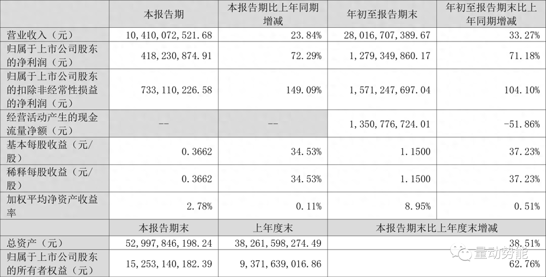 【季报】公司实现营业总收入280.17亿元,同比增长33.27%;归母净利润12.79亿元,同比增长71.18%;扣非净利润15.71亿元,同比增长104.10%;经营活动产生的现金流量净额为13.51亿元,同比下降51.86%;报告期内,东方日升基本每股收益为1.15元,加权平均净资产收益率为8.95%。