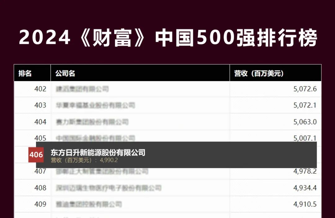 《财富》中国500强榜单采用与《财富》世界500强一脉相承的制榜方法,同时包括了上市和非上市企业。通过榜单公布的企业经营数据情况,社会可对中国最大企业的发展趋势有更加直观的掌握和了解。在本年度榜单中,东方日升作为光伏领域头部企业,以4,990.2百万美元的营收位列其中,且名次较上年度实现了29个位次上升。
