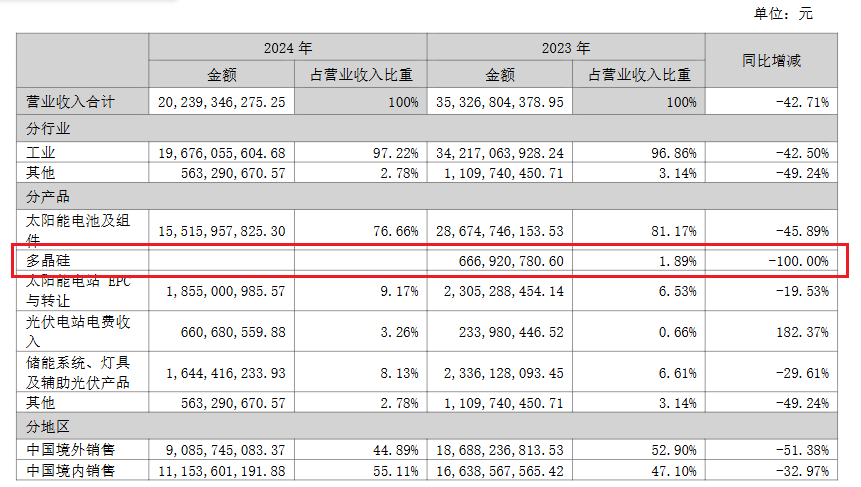 此外值得一提的是,2024年东方日升迅速退出了多晶硅业务,在此前多晶硅价格暴涨之下,东方日升曾拓展多晶硅业务,且在2023年收入达到了6.67亿元,而在2024年,东方日升的多晶硅业务收入为零,彻底退出了多晶硅业务。这也是其业绩同比出现下滑的原因之一。