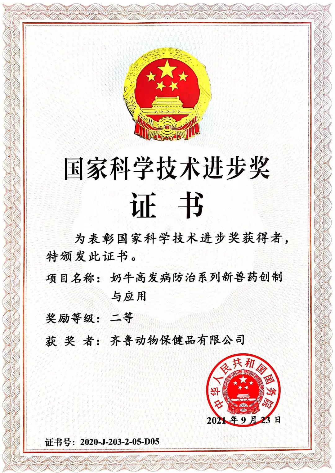 齐鲁制药集团旗下子公司齐鲁动物保健品有限公司凭借“食品动物新型专用药物的创制与应用”、“奶牛高发病系列新兽药创制与应用”两个项目一次性获得两项国家科学技术进步二等奖。这两个奖项是齐鲁动保继2019年因“动物专用新型抗菌原料药及制剂创制与应用”项目获得国家科技进步奖以来,获得的第2和第3个国家奖。