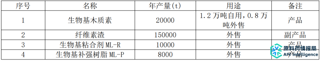 年产2万吨生物基木质素、1万吨生物基粘合剂、0.8万吨生物基补强树脂,副产纤维素渣15万吨。