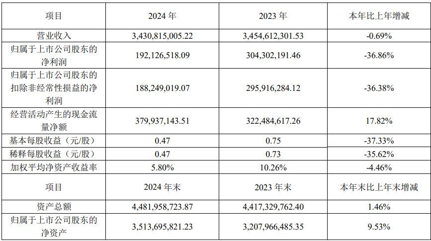 国内橡胶助剂龙头企业阳谷华泰(300121.SZ)近日披露的2024年年报显示,公司全年实现营业收入34.31亿元,同比微降0.69%;净利润1.92亿元,同比下降36.86%。值得关注的是,第四季度营收环比增长8.24%至8.96亿元,但净利润同比降幅扩大至84.08%,凸显行业周期波动下的经营挑战。