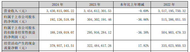 2022年至2024年,阳谷华泰营业收入分别为35.17亿元、34.55亿元、34.31亿元,归属于上市公司股东的净利润分别为5.15亿元、3.04亿元、1.92亿元,归属于上市公司股东的扣除非经常性损益的净利润分别为5.05亿元、2.96亿元、1.88亿元。