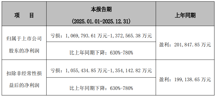 1月13日,重庆智飞生物制品股份有限公司(简称智飞生物)披露2025年度业绩预告。预计2025年归属于上市公司股东的净利润亏损106.98亿元~137.26亿元,比上年同期下降630%-780%,上年同期盈利201,847.85万元。