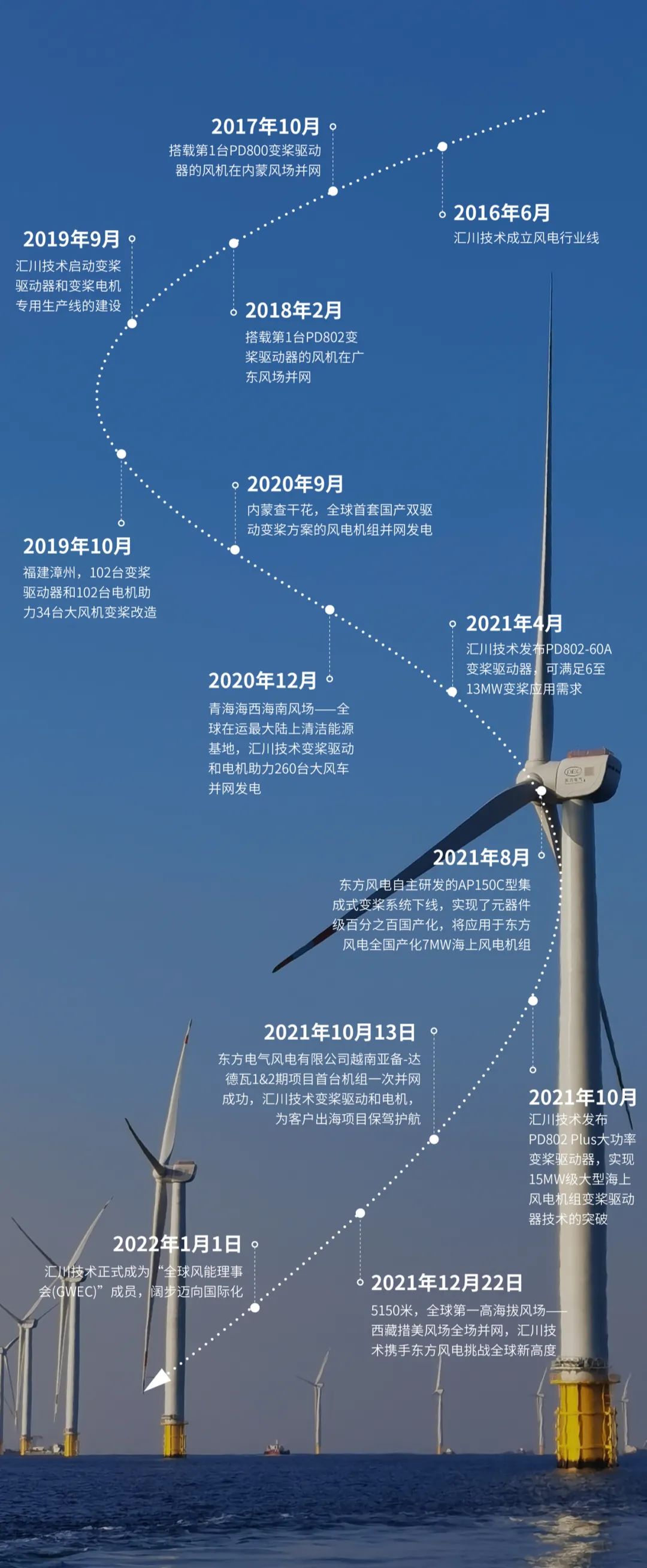 从2016年到2021,五年回望,初心如磐。汇川技术自2016年中成立风电行业线以来,致力于为风电客户提供风机驱动控制核心部件和风机降本增效解决方案,坚持创新、持续突破,产品和方案广泛应用于新建和改造项目变桨、偏航系统中,累计发货量超过10万台(其中变桨驱动器36000台,变桨电机33000台,偏航控制器32000台)。