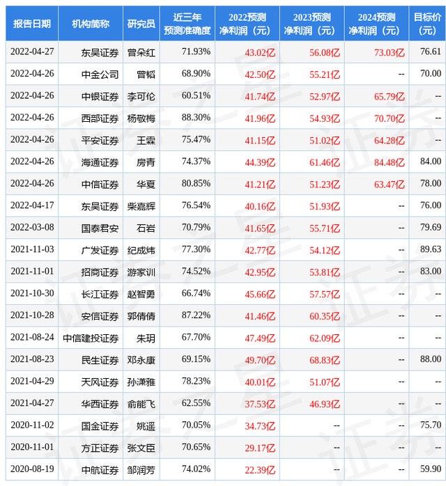 证券之星数据中心根据近三年发布的研报数据计算,西部证券杨敬梅研究员团队对该股研究较为深入,近三年预测准确度均值高达88.3%,其预测2022年度归属净利润为盈利41.96亿,根据现价换算的预测PE为35.1。
