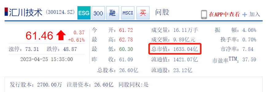 二级市场,目前汇川技术股价达到61.46元,总市值超1600亿(4.25数据为1635亿):