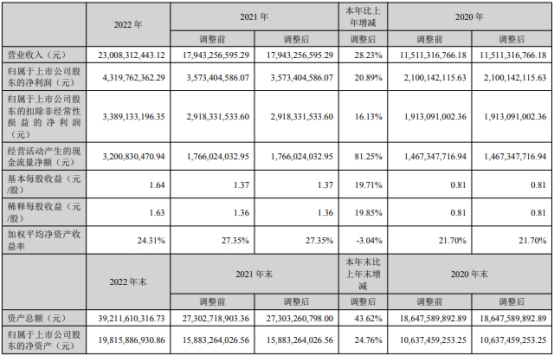 汇川技术2022年营业收入为230.08亿元,同比增长28.23%;归属于上市公司股东的净利润为43.20亿元,同比增长20.89%;归属于上市公司股东的扣除非经常性损益的净利润为33.89亿元,同比增长16.13%;经营活动产生的现金流量净额为32.01亿元,同比增加81.25%。