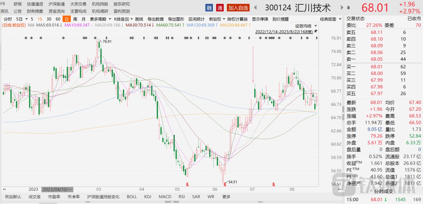 随着半年报业绩利好发酵,次日公司股票高开并震荡走高,盘中一度上涨至3.75%。截至8月22日收盘,股价收报68.01元,上涨2.97%,总市值1811亿元。