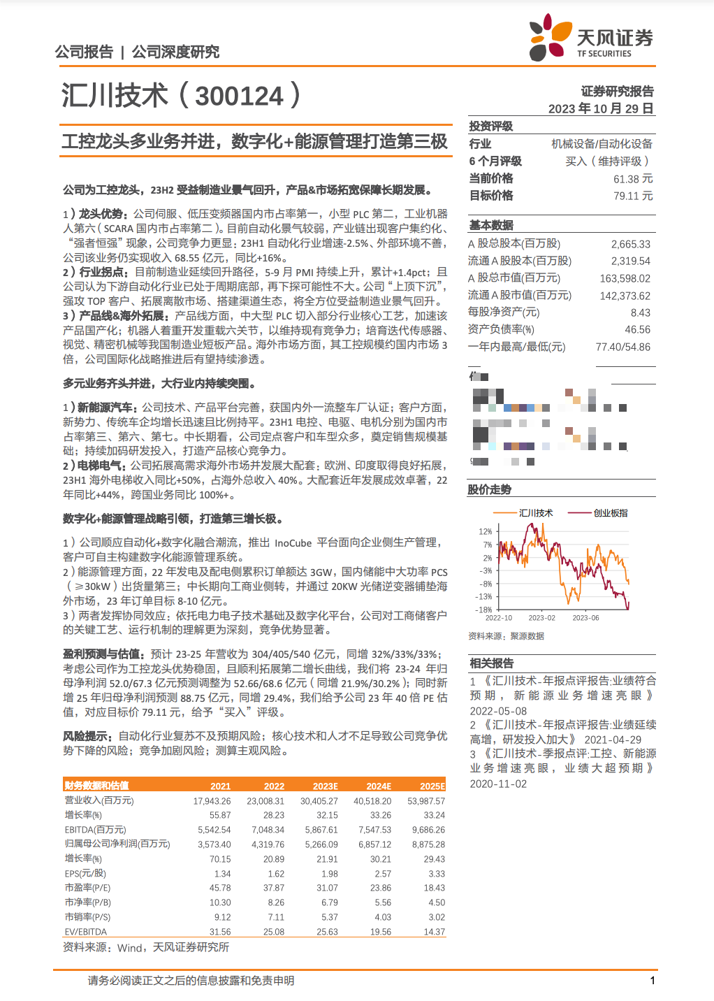 人、新能源汽车等业务仍具有较好的成长空间。②从中国市场向海外市场延伸:在现有业务的基础上,公司坚定走国际化道路,把市场做宽,从中国市场向海外市场延伸。因此,公司从2021年开始加大海外布局的力度,搭建了欧洲研发中心和匈牙利工厂,并加大了海外区域市场的布局,目前业务覆盖东南亚、南亚、欧洲、南美等市场。同时,公司也在进一步把中国市场中积累深厚的解决方案向海外跨国企业客户输出。③不断拓宽产品线:在变频器、伺服系统和PLC等产品的基础上,公司不断延伸产品线,为工业客户提供数字化解决方案、能源解决方案、传感器产品、工业视觉产品、气动产品等。把产品线做宽并持续提升市场份额,也是公司未来实现持续增长的动力。