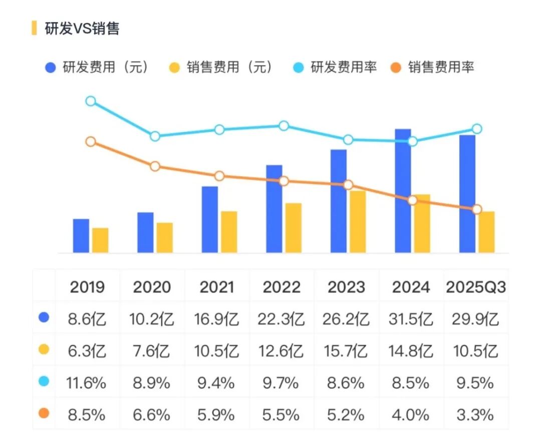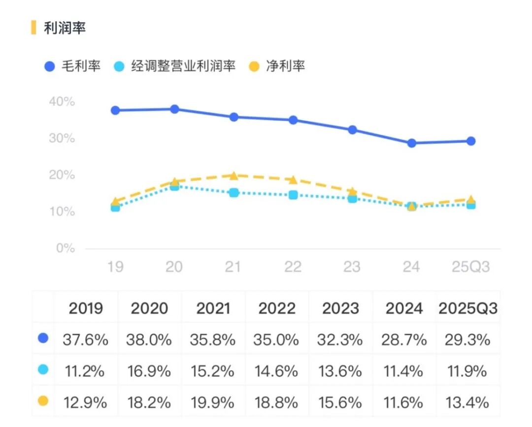 从核心盈利能力来看,2025Q3,公司毛利率为29.3%,较2024年提高约1个百分点,出现企稳迹象。同期,公司经调整营业利润率为11.9%,净利率为13.4%,较2024年提高了约两个百分点,回升明显。