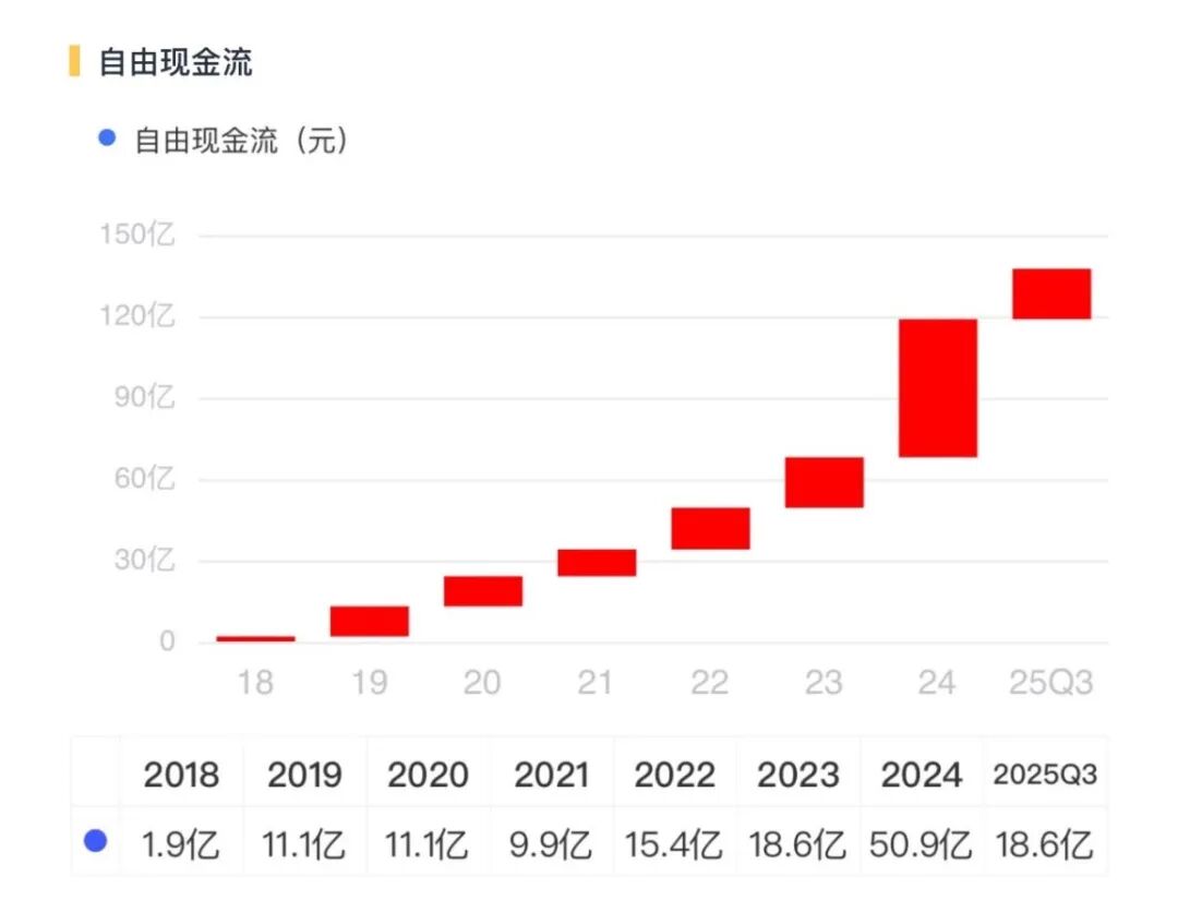 主业造血能力强劲的情况下,覆盖掉资本开支后,公司每年沉淀的自由现金流也在逐年递增,2024年达到51亿元,2025年前三季度也有19亿元。毫不夸张地说,公司已具备“现金奶牛”属性。