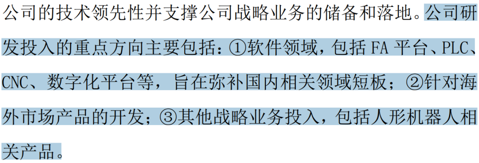 在2025年12月的投资者调研中,公司就表示后续的研发投入方向包括FA平台、PLC、CNC、数字化软件平台等,旨在弥补国内相关领域短板;以及针对海外市场产品的开发和人形机器人等产品。