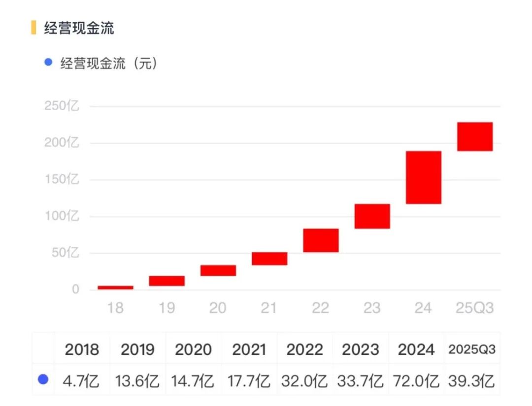 经营效率与核心利润率保持上升态势的背景下,公司通过主业经营获得的经营性现金净流入稳步增长,2024年达到72亿元,2025年前三季度达到39亿元。