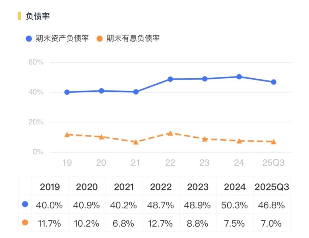 2025Q3,公司的期末有息负债率为7%,保持继续压降趋势,较2022年的12.7%下降了5.7个百分点。