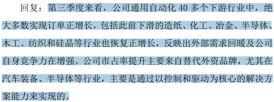 公司市占率提升主要来自替代外资品牌,尤其在汽车装备、半导体等行业,主要是通过以控制和驱动为核心的解决方案能力来实现的。