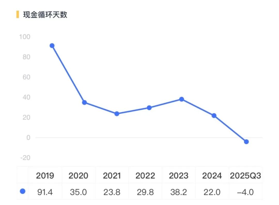 现金循环天数显示,公司经历“购存销”所需的现金循环天数已在2025Q3降为负值,表明公司运营能力与资金利用效率已达一流水平。