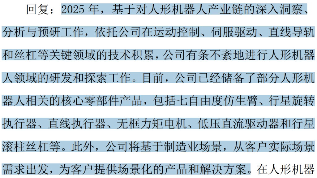 2026年1月,公司表示正与国内外主流人形机器人厂家沟通,批量订单仍需要时间,不过已成立智能机器人事业部,将举整体之力把握这一赛道机遇。