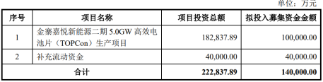 《电鳗财经》注意到,聆达股份本次定向增发拟融资14亿元,10亿元用于投资金寨嘉悦新能源二期5.0GW高效电池片(TOPCon)生产项目和4亿元补充流动资金。