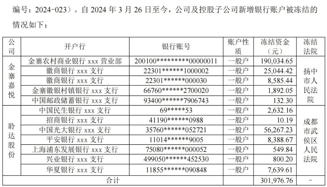 而2024年4月16日,聆达股份又新增部分账户被冻结。具体原因如下: