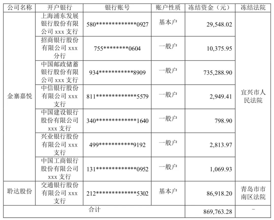 截至2024年4月16日,聆达股份及金寨嘉悦的银行账户资金被冻结的账户共计20个,其中为2个银行基本户和18个银行一般户,占聆达股份及金寨嘉悦基本户和一般户账户总数35个的57.14%。申请冻结保全金额合计为3364.32万元,实际冻结保全金额合计为117.15万元。