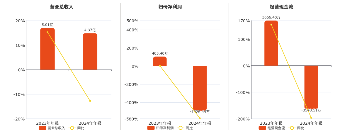公司营业总收入为4.37亿元,较去年同报告期营业总收入减少6400.01万元,同比较去年同期下降12.77%。归母净利润为-1926.44万元,较去年同报告期归母净利润减少2331.84万元,同比较去年同期下降575.19%。经营活动现金净流入为-3548.51万元,较去年同报告期经营活动现金净流入减少7214.91万元,同比较去年同期下降196.78%。