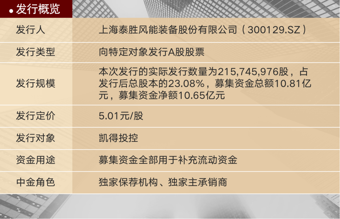 6月6日,上海泰胜风能装备股份有限公司(以下简称“泰胜风能”、“发行人”或“公司”,代码:300129.SZ)向特定对象发行A股股票项目(以下简称“本次发行”或“本项目”)成功完成。中金公司在本项目中担任独家保荐机构、独家主承销商。