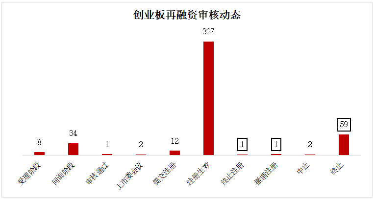 再融资方面,目前处于受理阶段8家,问询阶段的有34家,审核通过1家,上市委会议通过2家,提交注册12家,注册生效327家,撤销注册1家,终止注册1家,中止2家,终止(撤回)59家,合计448家。