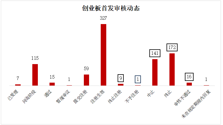 深交所信息显示,截止4月21日下午4时,创业板累计受理了847家企业的首发申请。其中处于受理阶段的有7家,问询阶段的有115家,15家近期通过上市委会议,1家暂缓审议。过会企业中,59家提交注册中,327家注册生效,9家终止注册,1家不予注册,另有141家中止审核,172家终止(155家撤回材料)。