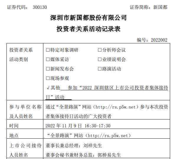 11月9日,嘉联支付母公司新国都参与“2022 深圳辖区上市公司投资者集体接待日活动”。在活动问答环节新国都答复了投资者最为关心的话题。