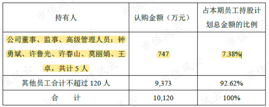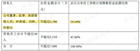 在第一期员工持股计划时,有54.14%、超过一半的份额分配给了钟勇斌、刘林、徐春山三位董监高。