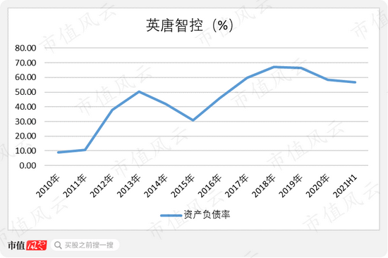 经营赚不到钱,并购又需要花钱,英唐智控的资产负债率也是不出意外的明显上升,截至2021年6月末达56.78%。