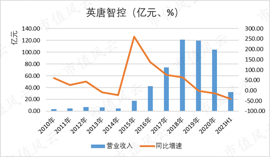 从收入变化来看,上市后,英唐智控的营业收入经历了一段低迷期,营收增速持续下滑,到2013年陷入负增长。