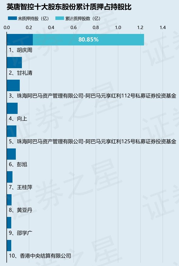 截止本公告日,股东胡庆周已累计质押股份9979.0万股,占其持股总数的80.85%。本次质押后英唐智控(300131)十大股东的累计质押股份占持股比例见下图: