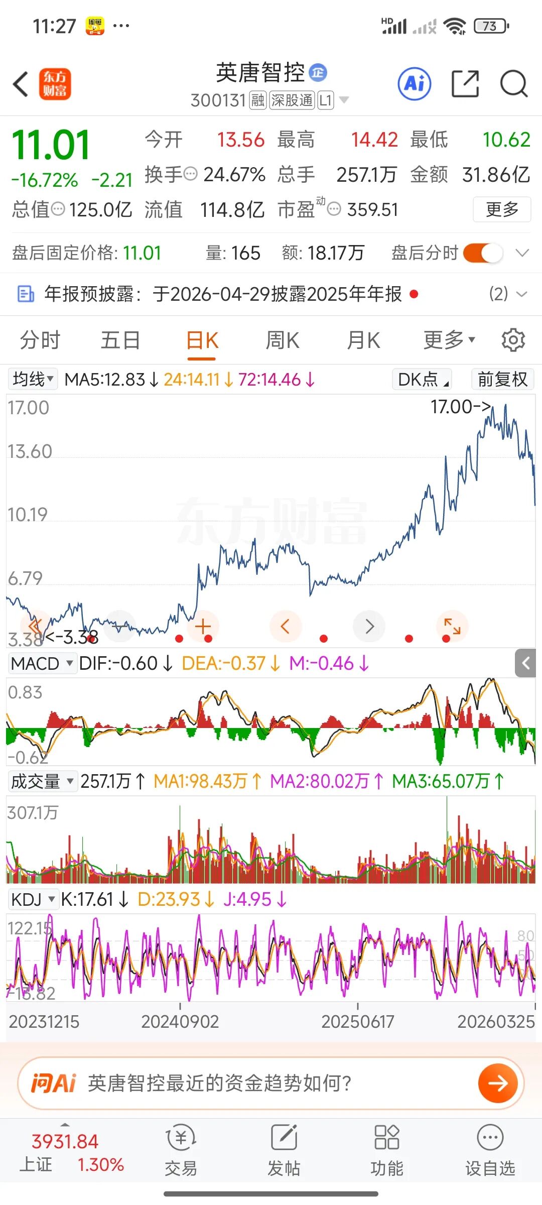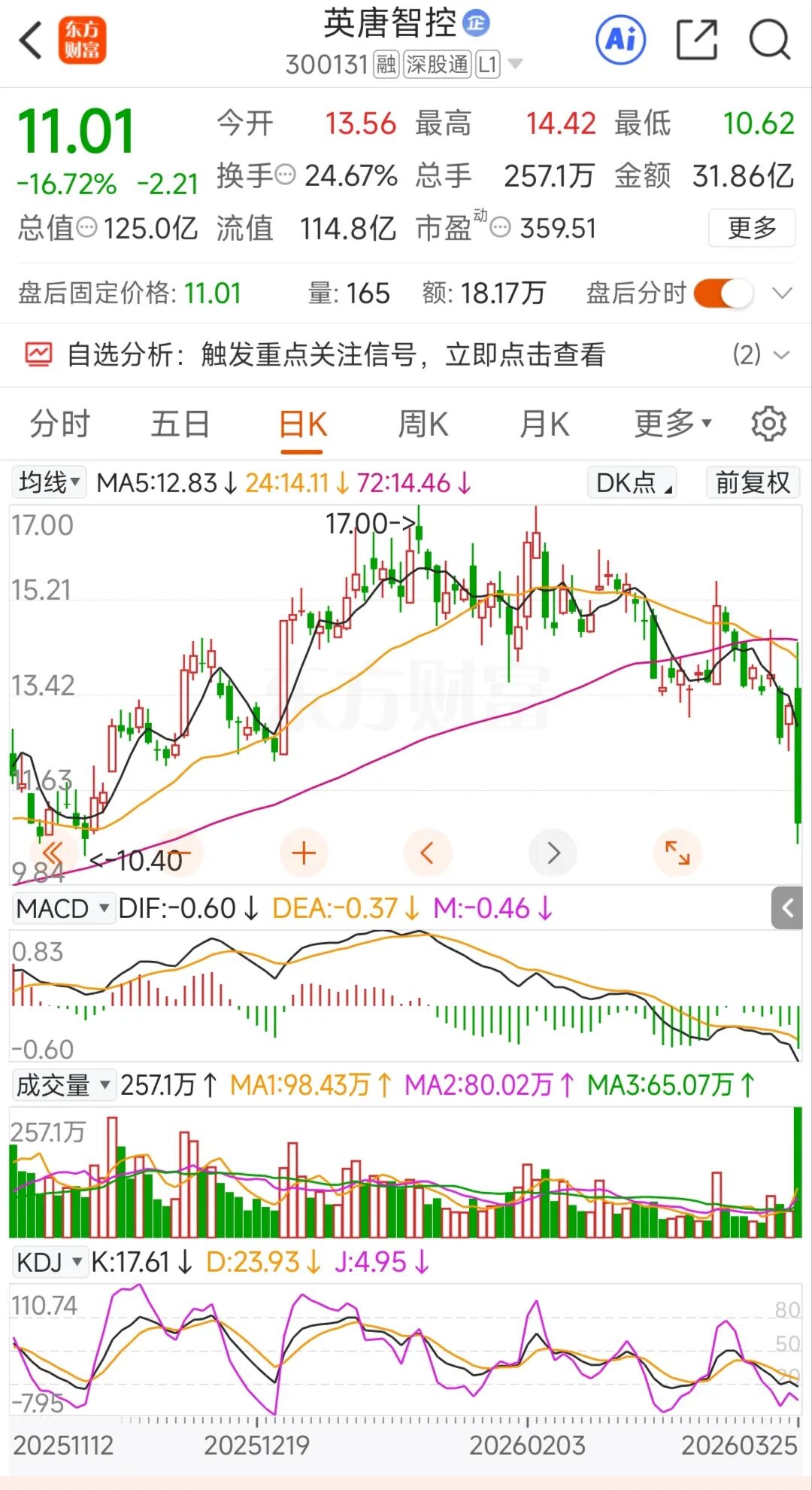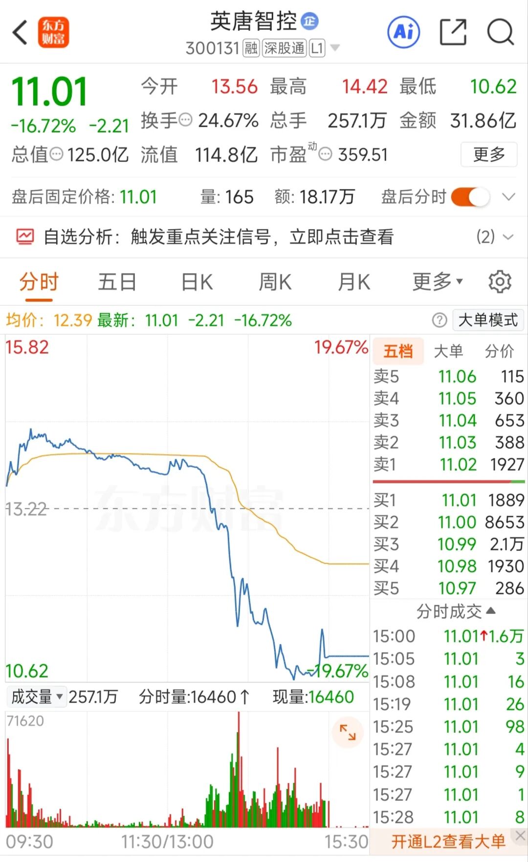 下午5点左右,再看一眼,不敢相信自己的眼睛,暴跌16.72%,大跳水啊。
