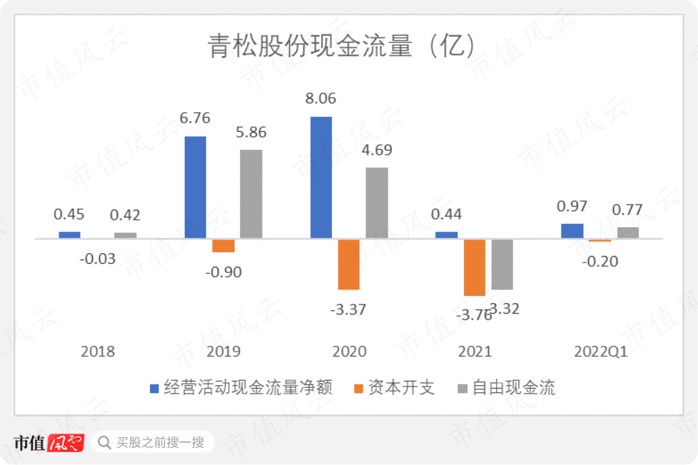 虽然,青松股份一口咬定扩产十分必要且合理,但是2021年公司的经营性现金流量净额明显下滑至0.44亿,自由现金流由正转负,同时有一定偿债压力。对于公司来说,如何拿出这9亿投资资金也是一个问题。