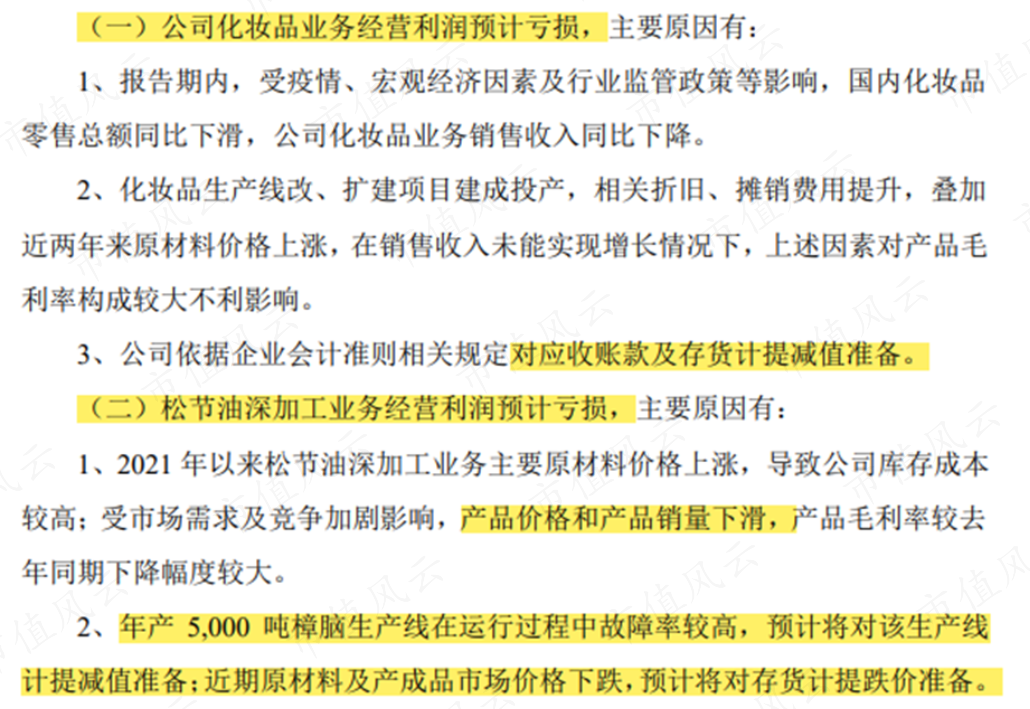 化妆品业务营收继续下降,公司对诺斯贝尔计提了应收账款及存货减值;同时,松节油深加工业务则产品价格、销量纷纷下滑,毛利率大幅下降,也将相应计提存货跌价准备。另外,樟脑生产线也因故障率较高而“被迫”减值。