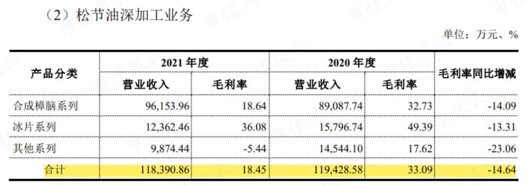 与此同时,青松股份原有的松节油加工业务也因原材料涨价、同行业竞争激烈等原因,盈利能力明显下滑,2021年该业务毛利率由33.09%下滑至18.45%,同样几乎打了对折。