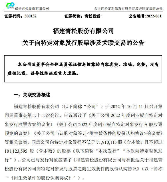 近日,大型松节油深加工企业,也是全球最大的合成樟脑生产企业的青松股份(300132.SZ)发布《关于向特定对象发行股票涉及关联交易的公告》,拟以4.45元/股的价格向公司董事林世达发行股票,募集资金不低于3.2亿元且不超过4.5亿元。据了解,交易完成后,林世达及其100%控股的诺斯贝尔合计持有青松股份的股权比例将不低于20.27%且不超过24.04%。届时,林世达将成为青松股份的控股股东、实际控制人。