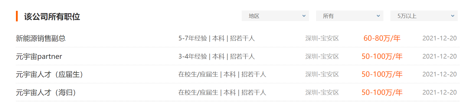包括元宇宙partner(合伙人)、元宇宙人才(应届生)、元宇宙人才(海归),薪资范围均在50万-100万/年,招工数量为若干人,工作地点为深圳宝安区。
