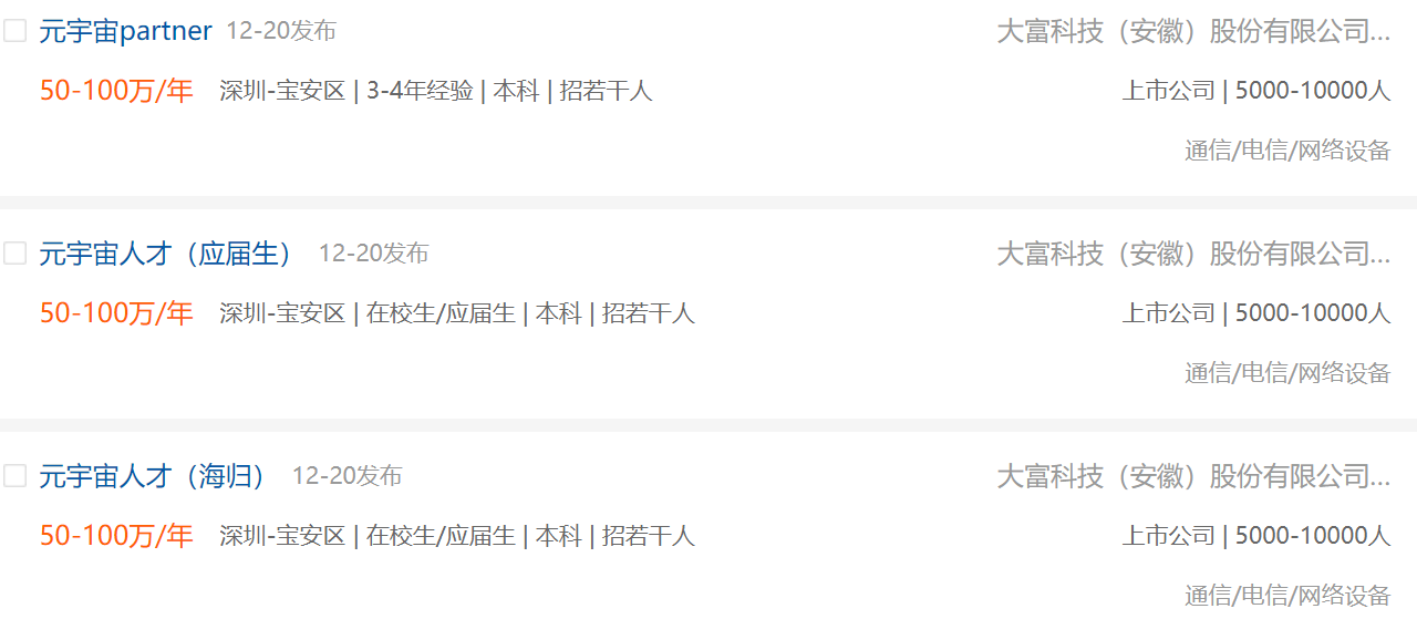 大富科技高薪聘请元宇宙人才,应届生最高可拿百万年薪