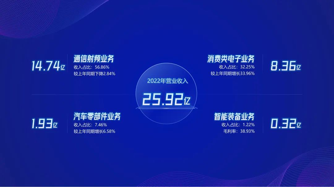 4月24日,大富科技披露2022年年报,报告期内公司实现营业收入25.92亿元,较上年同期增长5.76%。其中通信射频业务收入14.74亿元,消费类电子业务收入8.36亿元,较上年同期增长33.96%;汽车零部件业务收入1.93亿元,较上年同期增长6.58%;增加智能装备对外销售业务收入0.32亿元;其他0.57亿元。