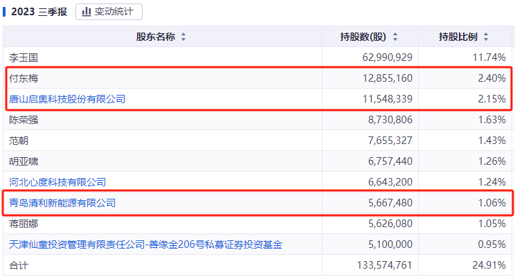 数据显示,截至三季度末,付东梅和启奥科技分别是先河环保的第二和第三大股东,清利新能源按持股数量看同样位于前十大股东之列。