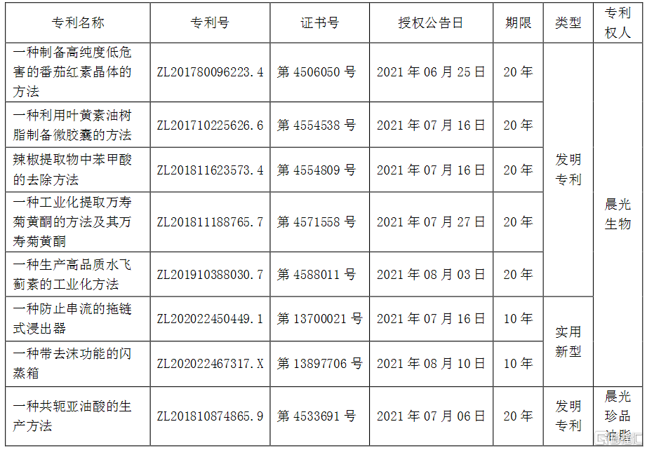 以上专利主要是克服现有技术中的不足,对现有工艺进行的改进和提升,其中“一种制备高纯度低危害的番茄红素晶体的方法”、“一种工业化提取万寿菊黄酮的方法及其万寿菊黄酮”、“一种生产高品质水飞蓟素的工业化方法”、“一种防止串流的拖链式浸出器”和“一种共轭亚油酸的生产方法”已应用于生产,其他专利将陆续应用于生产经营。上述专利的取得,有利于发挥公司的自主知识产权优势,形成持续创新机制。