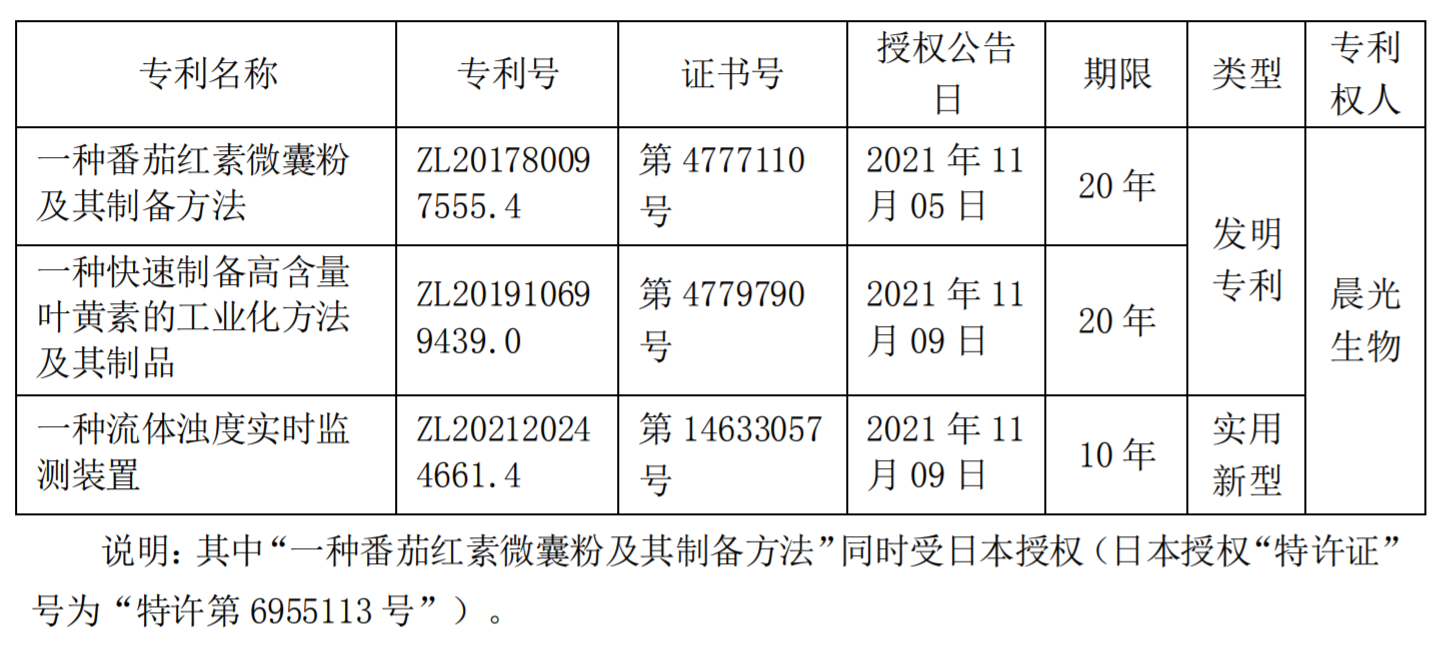 公告显示,晨光生物于近日正式取得了国家知识产权局颁发的三项专利证书,其中一项专利同时获日本专利管理部门授权。