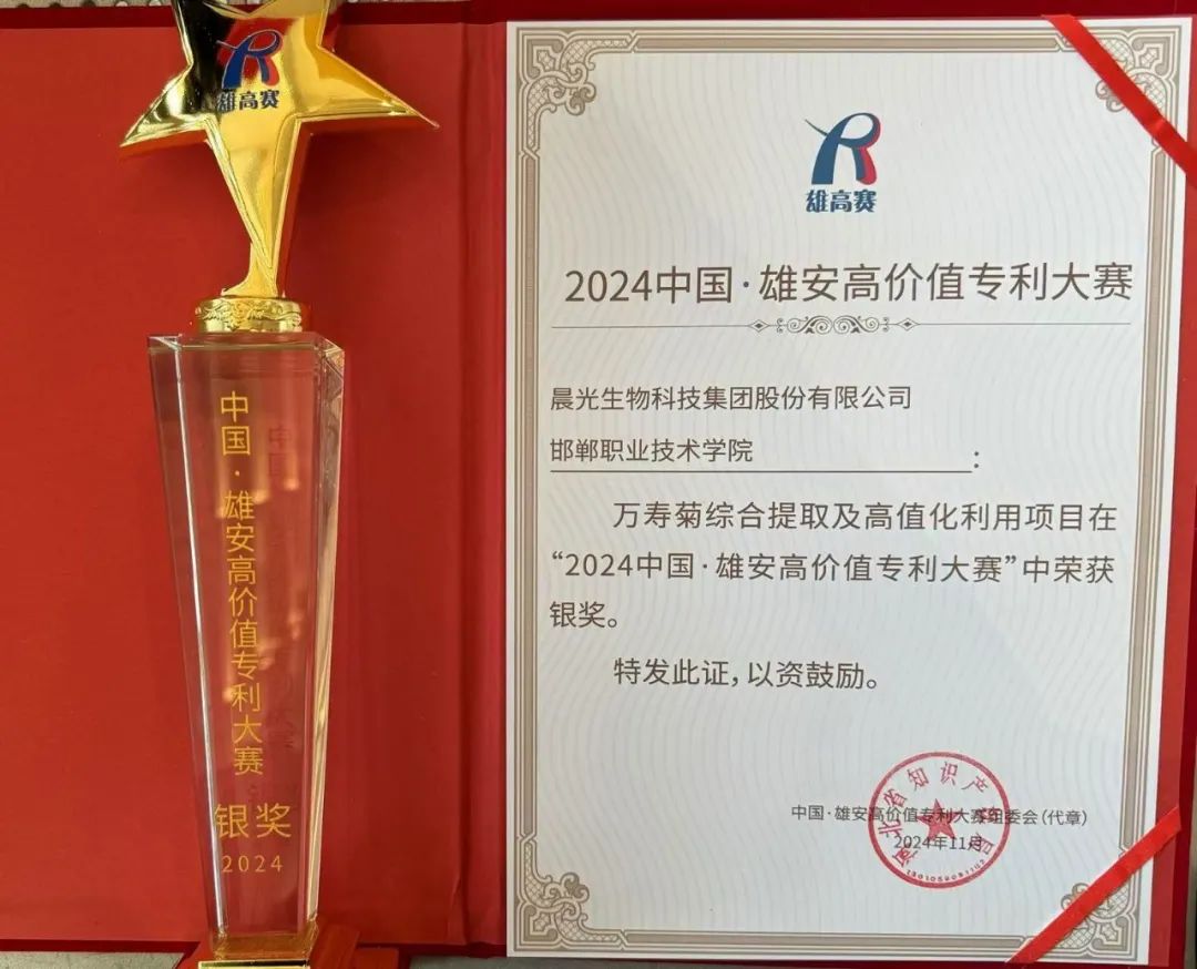 11月27日,2024中国·雄安高价值专利大赛颁奖典礼暨京津冀专利转化路演活动在雄安新区举办。晨光生物“万寿菊综合提取及高值化利用”项目获大赛银奖。