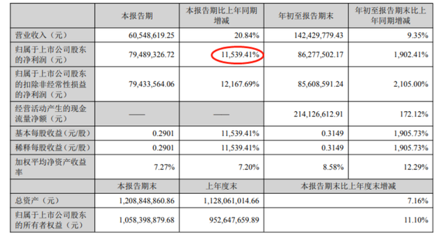 三季报显示,前三季度公司营业收入1.42亿元,同比增长9.35%;净利润8627.75万元,同比增长1902.41%。