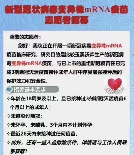 近日,网传信息显示,云南省安宁市第一人民医院I期临床试验研究中心在招募疫苗志愿者,为新冠病毒变异株mRNA疫苗进行临床研究,目的是在完成3剂新冠灭活疫苗接种的成年人中,对比玉溪沃森生产的新冠变异株mRNA疫苗和重组疫苗的保护效力和安全性。